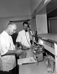 Ernest C. Reed, left, assistant manager of the new Jack Colliner Professional Drug Store, and T. H. Cleveland, store manager, are shown with scales, mortar and pestle. Both men are registered pharmacists. Published in the Fort Worth Star-Telegram morning edition December 7, 1950.