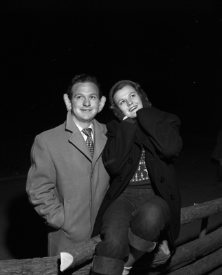 They thought the Star-Telegram's community Chistmas tree was wonderful in its frosty setting in Burk Burnett Park. Perched on the rustic fence at the tree's base is Miss Faye Broome of 2328 Goldenrod, and her escort (a nominee for Mr. Earmuffs of 1950) is Bill Inman of 3419 E. Belknap. Published in the Fort Worth Star-Telegram evening edition December 6, 1950.
