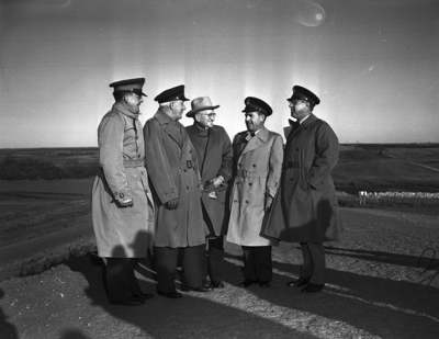 Making a quick tour of U. S. Corps Engineers projects in the Fort Worth-Dallas area, Major General Lewis A. Pick, second from left, expressed surprise at the progress of work at the Grapevine and Benbrook dams since his last visit here 13 months ago. Braving the cold winds atop the Grapevine Dam with him were, left to right, Colonel. Louis W. Prentiss, John M. Foutus of the Trinity Improvement Association, Colonel W. E. Potter and Colonel Delbert B. Freeman. Published in the Fort Worth Star-Telegram morning edition December 7, 1950.