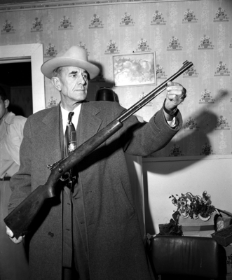Deputy Sheriff John Roberts is shown with the.22 caliber bolt action rifle found under the body of Mrs. Homer P. Jenkins of Kennedale. Published in the Fort Worth Star-Telegram evening edition December 7, 1950.