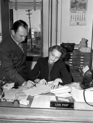 Attorney Byron Matthews is shown filing applications for writs of habeas corpus in behalf of 10 gamblers and police characters seized here. With him is Mrs. E. G. Post of the Criminal District Clerk's office. Published in the Fort Worth Star-Telegram evening edition December 6, 1950.