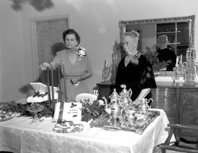 Mrs. J. B. Holmes, right, president of the University Place Study Club, was honored when the club gave an open house at the home of Mrs. G. E. Cook, left, 3632 Manderly Pl. Published in the Fort Worth Star-Telegram evening edition December 8, 1950.
