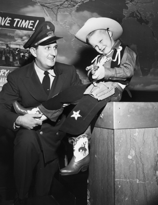 Buzzie Bonnell, 5-year-old son of American Airlines Captain William Bonnell, tries out the cowboy outfit given by Fort Worth "Santa" to Michael Connolly of England who wrote to "Father Christmas" in Texas asking for it. Giving an assist with the boots is Harry Darcy, airlines ticket agent. Published in Fort Worth Star-Telegram evening edition December 7, 1950.