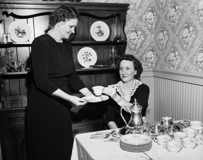 Mrs.. Reed Stewart of Crowley, council chairman standing asks for "tea with lemon" as Mrs.. William Watt of Saginaw pours at the Tarrant County Home Demonstration Club Council's 25th anniversary tea. Published in Fort Worth Star-Telegram morning edition December 8, 1950.