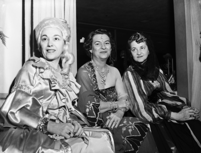 Three women in costumes seated at the "Ball of All Nations."