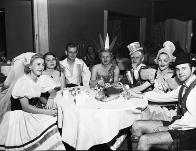 A group of people in costumes seated at a table. This photo was taken at the "Ball of All Nations."