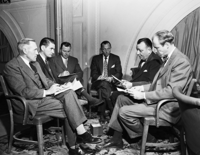 Season sales committeemen Burdette Brants, Elmo Webb, J. C. Riley, S. M. Bingham, Chairman Paul Moon and Guy Rogers Jr. Published in Fort Worth Star-Telegram morning edition December 9, 1950.