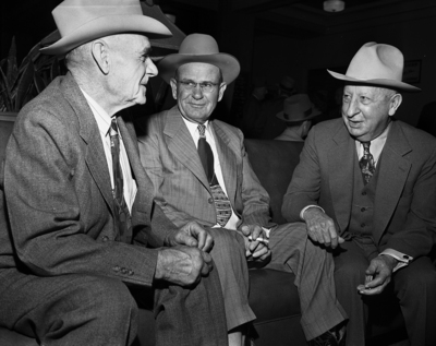 Among early arrivals for the third quarterly meeting of the Texas and Southwestern Cattle Raisers Association directors in Hotel Texas were, left to right, Joe Lane of Roswell, N. M., R. T. Waddell of Odessa and Dick Arnett of Kansas City. Published in Fort Worth Star-Telegram morning edition December 9, 1950.