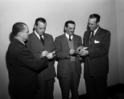Salesmen Walter Douning, left, and Jimmy Matthews, right, of Double-G Club start ball rolling toward filling Will Rogers Memorial Coliseum for Golden Gloves tournaments by selling J. W. Shugart Jr., Left center, and Jack Canning block of reserve seats for employees of Southwestern Petroleum Company. Published in Fort Worth Star-Telegram evening edition December 11, 1950.