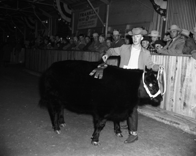 Eugene Mote, Tulia, Texas, a 4-H boy, showed the champion Angus steer of the boys' steer show. The winner's name is "Blossom."