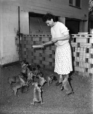 Crowded by an eager audience Mrs.. Kurt Schnellenbach gets ready to present her version of what is being prepared for the better chow times in Fort Worth's doggy circles. Published in Fort Worth Star-Telegram evening edition December 14, 1950.
