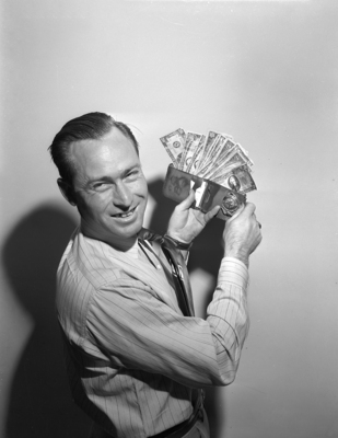 Image shows Key Herbert, photographer, posing with $100 award he won in the "Gold in the Barrel" drawing. W. K. Brown, linotype operator, and James R. Record, managing editor, won $50 each. Published in Fort Worth Star-Telegram December, 1950.