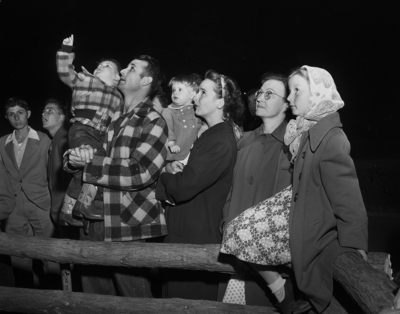 Twinkling lights and heart-warming music of the Star-Telegram's community Christmas tree in Burk Burnett Park seem to cast a spell over those who come to see it each night. Charles William Hudson, two half's, points a chubby finger at a bright cluster of ornaments, which also hold the interest of his father, W. J. Hudson, and aircraft inspector, and Mrs.. Hudson, holding year-old Linda Carol, whose gaze is captured by another shiny object. Jo Ann Mullins, 8, at right, and her mother, Mrs.. Joe Mullins, also seem entranced by the tree. Published in Fort Worth Star-Telegram evening edition December 11, 1950.