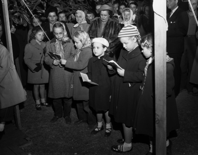 Serious about their carol singing, five girls do their best to keep pace with one of the choirs giving a concert at the Star-Telegram community Christmas tree in Burk Burnett Park. Intent on song books, they are, left to right, Barbara Berglund, 10; Joanne Berglund, 8; Ann Voss, 6 (the organist has her attention); Evelyn Ann Porter, 7, and Eva Jane McLean, 7. Published in Fort Worth Star-Telegram evening edition December 12, 1950.