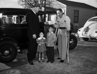 Police Captain Karl Howard, left, presents the little of ownership papers to Radio Patrolman J. M. Latham, on an automobile given by Latham's fellow officers to replace the car that was demolished in a traffic accident in which the recipient suffered a broken leg. Watching are Latham's daughter, Jamye, and son, Mike. Published in Fort Worth Star-Telegram morning edition December 11, 1950.