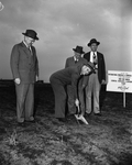 Luis Ware of Chicago, president of International Minerals and chemical Corporation, yelled for help when he encountered hard ground in turning first shovel of dirt of a new industry in Fort Worth, while Mayor Deen (left), and Maurice H. Lockwood, vice president of International, watched the ceremony. Published in Fort Worth Star-Telegram morning edition August 14, 1950.