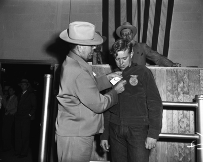 Waters S. Davis Jr. of League City, president of the Texas Association of Soil Conservation District Supervisors, presents a medal for the high score in the Stock Show grass judging contest to Joseph M. Auld Jr., Kerrville, Texas, FFA (Future Farmers of America) boy.