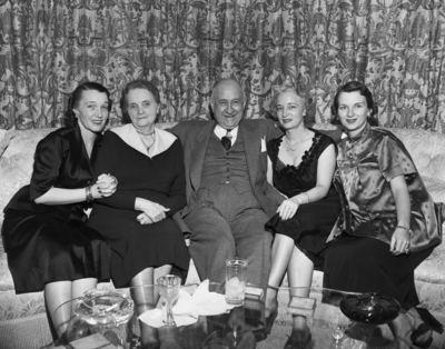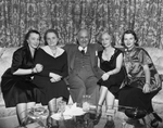 Amon Carter seated between four men at his Birthday celebration. Among the four women are: Minnie Carter, second right, and Ruth Carter, right.