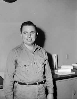 Image of J. R. Morrison, who works in the mailing room. He is standing in the mail room. Published in Fort Worth Star-Telegram December 1950.
