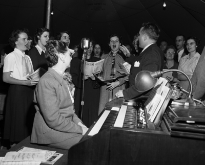 Some of the singers in a concert by combined choirs of Travis Avenue Baptist Church at the Star-Telegram community Christmas tree in Burk Burnett Park. Saxe Adams, right, is the choir director and Mrs.. M. E. Erwin, organist, is in the foreground. Front row singers, left to right, are Miss Marian Watkins, Mrs.. James Clayton, Mrs.. Bob Maulden, Miss Marilyn Hicks, Mrs.. J. E. Kirkpatrick and Miss Billie Cramer. Published in Fort Worth Star-Telegram morning edition December 12, 1950.