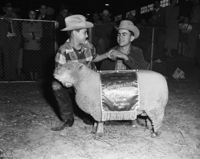 The Bridgeport brothers, Billy, left, and David, 4-H Club boys from Colorado City, shake hands as "Okie," a Southdown lamb, was judged grand champion lamb of the Boys' Lamb Show at the Southwestern Exposition and Fat Stock Show.