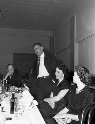 Fain Reynolds, City Circulation manager, was one of the speakers. Mrs. Reynolds pays close attention to her husband's remarks. Published in Fort Worth Star-Telegram December 1950.