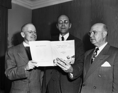 Maurice H. Lockwood, center, vice president of International Minerals and Chemical Corporation, was talking about industrial expansion of Fort Worth when the picture was made. His listeners were Harold S. Foster, left, assistant manager, and William Holden, executive vice president of the Chamber of Commerce. Ground will be broken for a new fertilizer plant for Lockwood's company in Fort Worth. Published in Fort Worth Star-Telegram morning edition December 13, 1950.