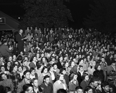 As hundreds of children from 12 Red Feather Community Chest agencies gazed with upturned faces at the brilliant lights of the Star-Telegram community Christmas tree, Russel R. Rine, at left on platform, read Henry Van Dyke's "Keeping Christmas." The picture shows only a small cross-section of the crowd which attended the tree ceremonies and music festival in Burk Burnett Park. Published in Fort Worth Star-Telegram evening edition August 13, 1950.