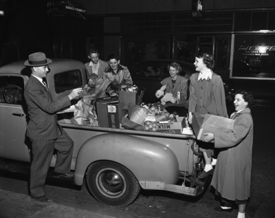 Here is a truck load of Christmas gifts nine Tarrant County Methodist churches presented to the local Bethlehem Center for Negro youths. Shows checking the clothing and food, part of the gift collection valued at about $1000, are Reverend Edwin L. Hall, Euless pastor; Melvin Fuller, James Tillery, Glada Horton, Bettie Horton and Betty Anderson. Published in Fort Worth Star-Telegram evening edition December 14, 1950.
