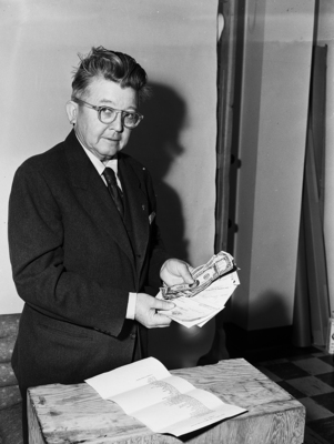 Houston P. Hutchiens of Nored-Hutchens Commission Company for the 16th year delivers the Stockyards R. B. Mayo Fund to the Star-Telegram cashier. Published in Fort Worth Star-Telegram evening edition December 14, 1950.