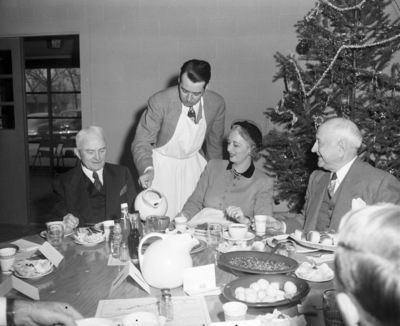 Dedication of first resident camp at Amon Carter YMCA Camp; from left, Reverend J.K. Thompson, W.K. Stripling Jr., Mrs. Amon Carter, Amon Carter, 12/13/1950