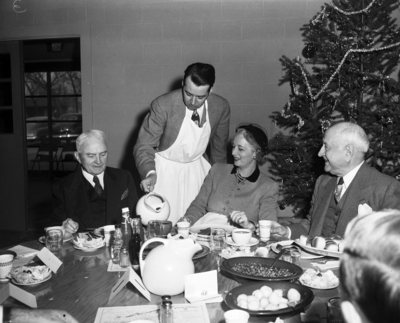 YMCA Camp Committte Chairman W. K. Stripling Junior, in apron, serves coffee to Minnie Carter at the dedication luncheon as Reverend J. K. Thompson, left, and Amon Carter look on.