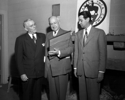 Amon Carter standing between two men in a photo taken at the dedication of first resident camp unit of Amon Carter Young Men's Christian Asociation Camp.