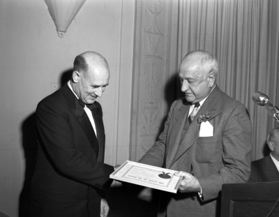 Louis Ware, left, president of the International Minerals and Chemical Corporation, accepting a certificate that grants him Texas citizenship from Amon Carter. This picture was taken at the Chamber of Commerce annual dinner.