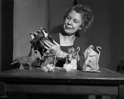 Mrs.. Ann Fisher Kammer is shown examining the wax models made by the children of First Congregational Church school depicting the Christmas Story. Published in Fort Worth Star-Telegram evening edition December 16, 1950.