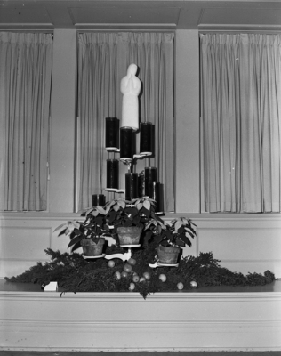 Mrs.. J. Lee III's Madonna with white poinsettias and white altar candles in green containers won a blue ribbon for Mrs.. William Cranz. Published in Fort Worth Star-Telegram evening edition December 14, 1950.