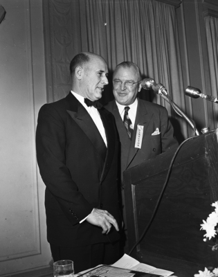 Louis Ware, president of International Minerals and Chemical Corporation, left, made the principal address at the annual Chamber of Commerce dinner. He was introduced by George Thompson Jr., right, president of the Chamber of Commerce. Published in Fort Worth Star-Telegram morning edition August 14, 1950.