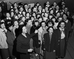 Arlington Heights High School students from three choral classes combined to sing a group of seasonal songs at the Star-Telegram Community Christmas Tree and Music Festival in Burk Burnett Park. Directing them in one of several spirited numbers is Mrs.. Mary Smith White, in foreground, head of the school's music department. Published in Fort Worth Star-Telegram morning edition August 14, 1950.