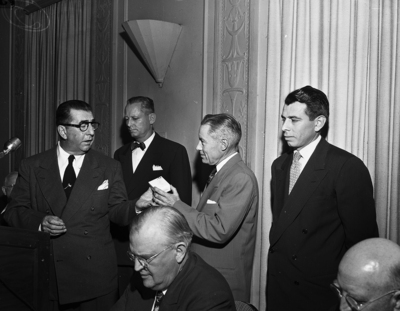Leroy N. Olmsted, left, Chamber of Commerce continuous membership chairman, presents a silver life membership card to U. N. Malone, new 150 Club member, third from left, while F. C. Bradley, second from left, and Sheldon Olmsted, right, who were similarly honored, watch. Published in Fort Worth Star-Telegram morning edition August 14, 1950.