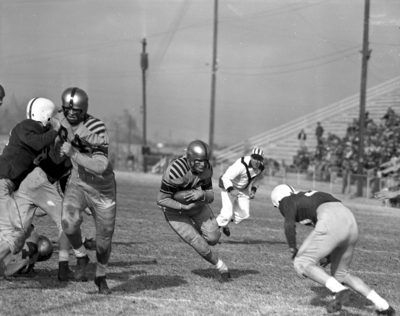 Rick Sprinks, star Kermit back, shoots through a hole in the Arlington line to score the Yellow Jackets' first touchdown in the game at Abilene. The play started on the half-yard line and came in the second period. Kermit won, 21-12. Published in Fort Worth Star-Telegram morning edition December 16, 1950.