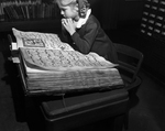 Mary Michael Magner, first grader at St. Ignatius Academy, takes the first public look at a 7th Century Gradual at the Public Library. Mary is the daughter of Captain and Mrs.. George Magner, 3012 Bristol Rd. her father is in infantry, fighting in Korea. Published in Fort Worth Star-Telegram morning edition December 15, 1950.