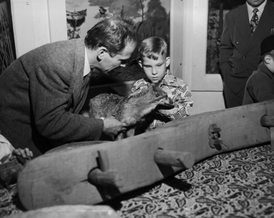 Loyd Drenna, right, son of Mrs.. W. M. Brewer of 209 Sunset Lane, feels a coyote in a guessing game at the annual Arlington Heights Lion Club party for blind children at the Children's Museum. David M. Bigelow, curator of Natural history, left, awaits the boy's answer. Published in Fort Worth Star-Telegram morning edition December 22, 1950.