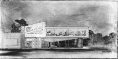 Here is an architectural conception of the modern structure being built in Haltom City for Carriher Furniture and Appliances , Ltd., a newly organized suburban store firm. Published in Fort Worth Star-Telegram morning edition December 17, 1950.