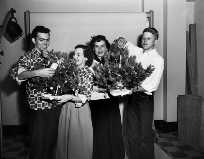 Members of Girl Scout 37 and Boy Scout Post 2011 are decorating Christmas trees with candy, small toys and chewing gum for patients in the City-County Hospital polio ward. Holding two of the trees are, left to right, J. W. Adams, Hilda Sue Owen, Gerald Dean Pierce and Ray Holden. All are students at Amon Carter Riverside High School. Published in Fort Worth Star-Telegram morning edition December 17, 1950.