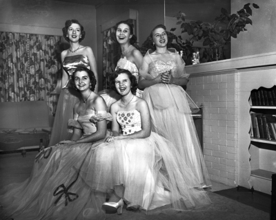 Five of the six teen-age girls who were hostesses at a formal dance at River Crest Country Club are, left to right, standing , Misses Mary Anne Preston, Nina Maria Korth, and Janet Isaacks; seated, Misses Anne BrightWell and Diane McFarland. Published in Fort Worth Star-Telegram evening edition December 17, 1950.
