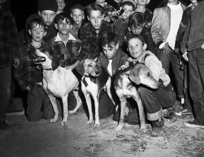 Some of the boys from 16 West Side YMCA Clubs cluster around the hounds at Camp Center awating the signal to begin a possum hunt. About 80 boys took part in the hunt. Published in Fort Worth Star-Telegram morning edition December 16, 1950.