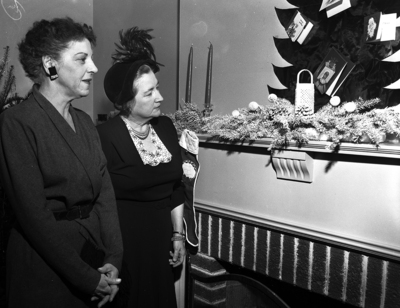 Mrs.. Carlos Weatherford, left, explains how to make mantel decorations to Mrs.. J. C. Owens, president of the Athenaeum Club. Published in Fort Worth Star-Telegram evening edition December 18, 1950.