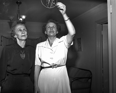 The two hostesses at the club luncheon examine a "kissing ball". They are Mmes. C. P. Phines, left, and Benson G. Wells. The "kissing ball" was made from two embroidery hoops, covered with red satin ribbon, holding a spring of mistletoe. Published in Fort Worth Star-Telegram evening edition December 18, 1950.