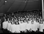 Choral groups of three elementary public schools combined to sing carols at the Star-Telegram community Christmas tree and music festival in Burk Burnett Park. In left background, standing with the group of children are, left to right, Miss Natha Howell, Miss Willie Fayette Montgomery, Mrs.. Ava Nell Hudging, Miss Alma Ray (who directed the chorus), and Miss Sheila Allen and Mrs.. Louise Doyle, who played the Hammond organ. A part of the audience also is visible in the background. Published in Fort Worth Star-Telegram morning edition December 17, 1950.