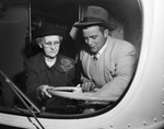 Mrs.. T. W. Tomme, whose father, H. E. brown, was Dublin postmaster during stage coach days, looks at controls of the Highway Post Office which went into service between Waco and Eastland. With her is the driver, Elliott Rogers of Waco. Published in Fort Worth Star-Telegram morning edition December 17, 1950.